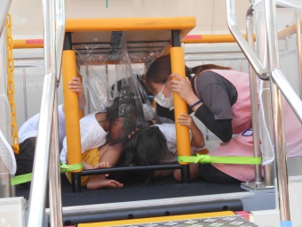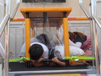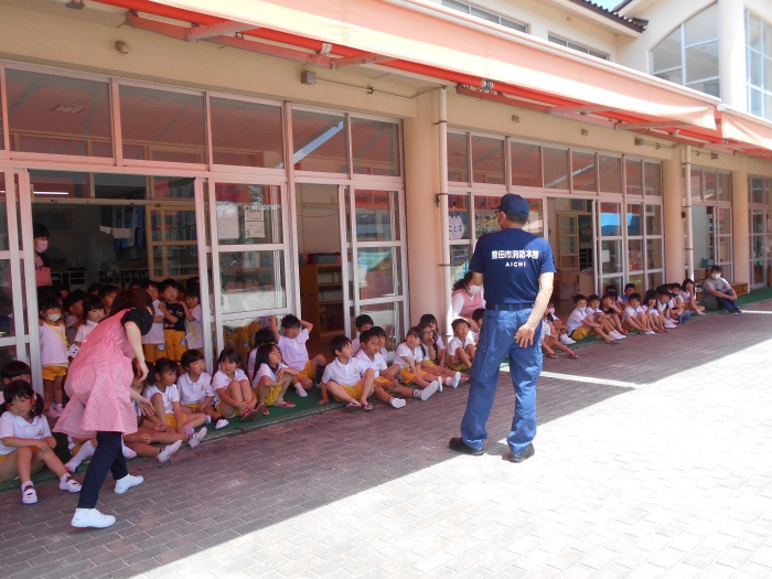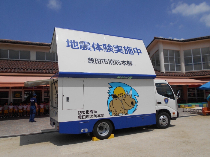 豊田市消防本部から防災指導車の「防サイ君」が幼稚園に来てくれました。消防署の方が「防サイ君」の乗リ方を教えてくださり、地震体験をしました。机の下にもぐり、頭を守って揺れがおさまるのを待ちます。体験は震度5で、子どもたちは真剣に体験することができました。