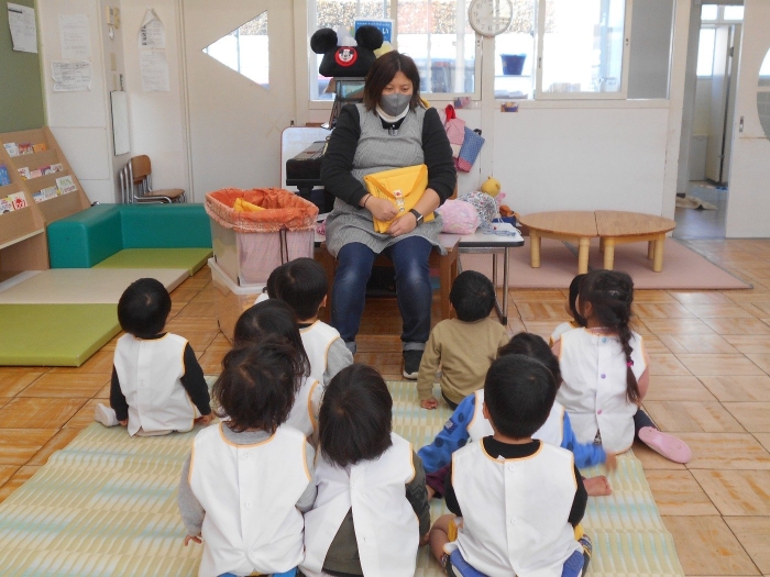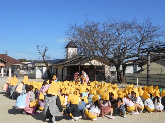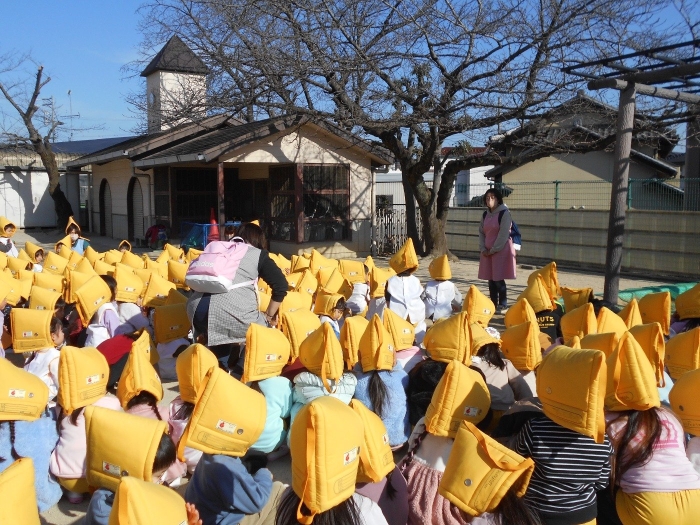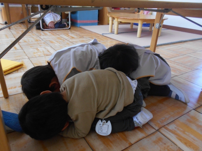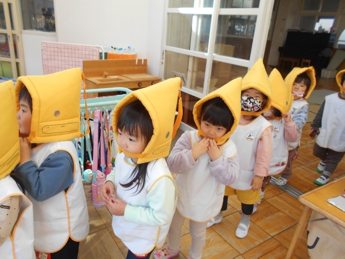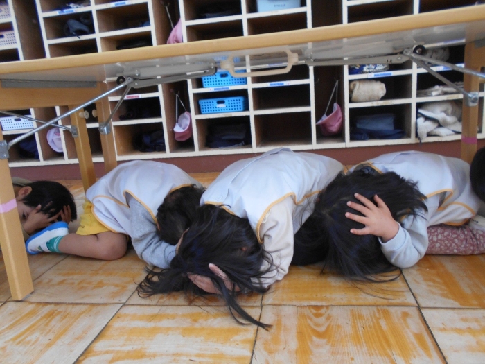 今日は「地震」を想定した避難訓練をしました。先生から地震についての話を聞き、安全な机の下にもぐって「だんごむし」になったり、防災頭巾をかぶって園庭に避難をしました。訓練ということで、お子さま達は真剣な眼差しで先生の話を聞き、落ち着いて避難することができました。