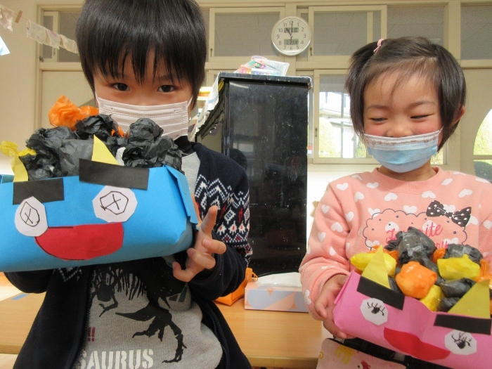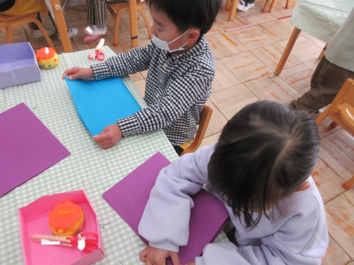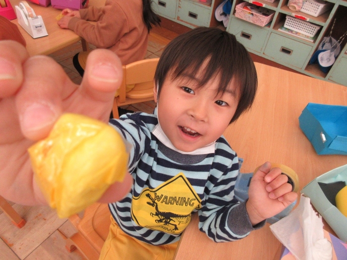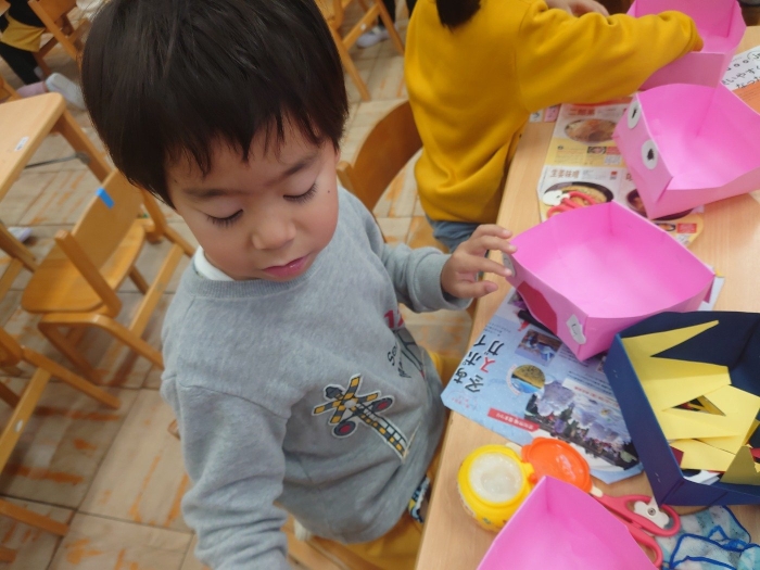 2月3日の節分に豆まきをすることを伝えると「本物の鬼が来るの!?」と驚くお子さま達!!鬼を退治出来るように豆を作ろう!!ということで豆と豆を入れる箱を作りました☆