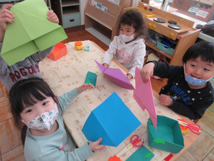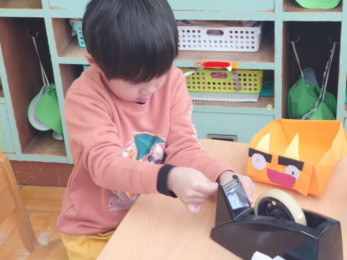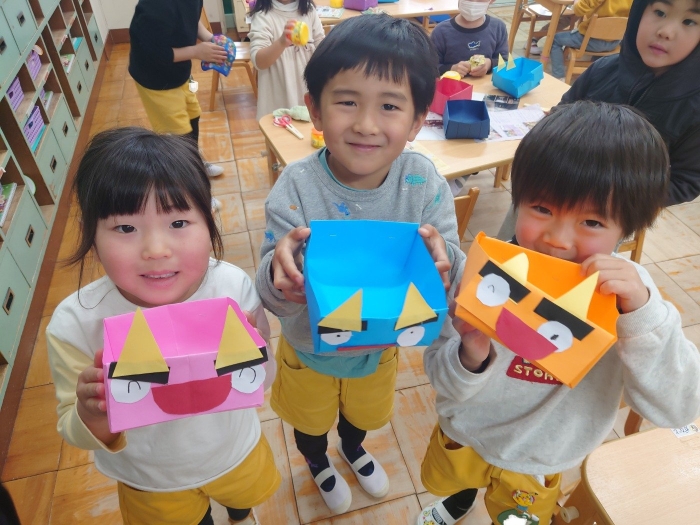 今回は折り紙ではなく画用紙を使って箱を作りました♪いつもより硬く、大きいため「難しい」というお子さまもいましたが「折筋をしっかりつけようね」「ゆっくり丁寧にやってみよう」と伝えるとどのお子さまも最後まで折ることが出来ました♡角、目、眉毛、口のパーツを線に沿って切り、箱に貼ったら鬼の顔付き豆箱の完成★