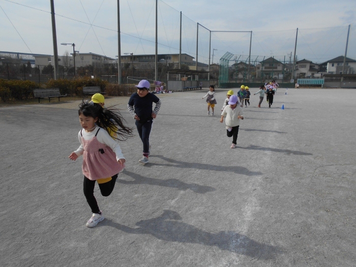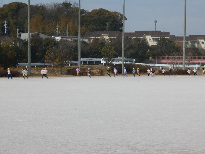 2月末に行われる「マラソン大会」に向けて、マラソンに取り組み始めました。最初はみんなで園庭を走るところからはじめ、今は近くの若園運動広場まで歩き、準備体操をしてから走っています。大きな広場を2周!!途中、苦しくなって歩きたくなることもありますが、先生たちの「がんばれーー!!」の声援に励まされてどの子もゴールめざしてがんばっています(^▽^)/お天気のいい日は毎日走ってきまーす!!!