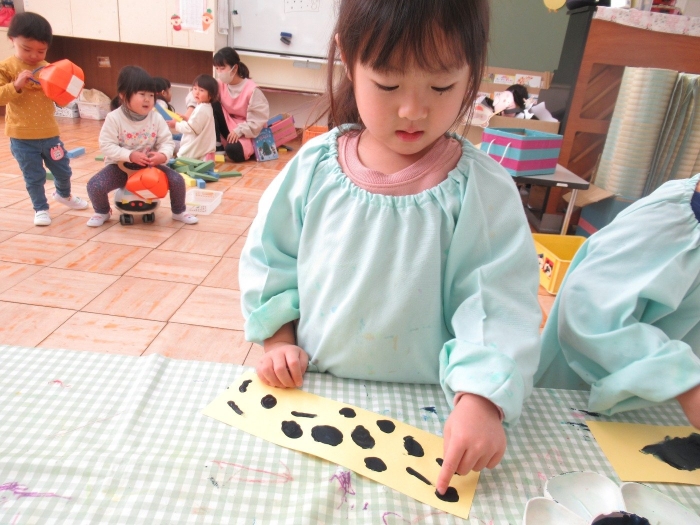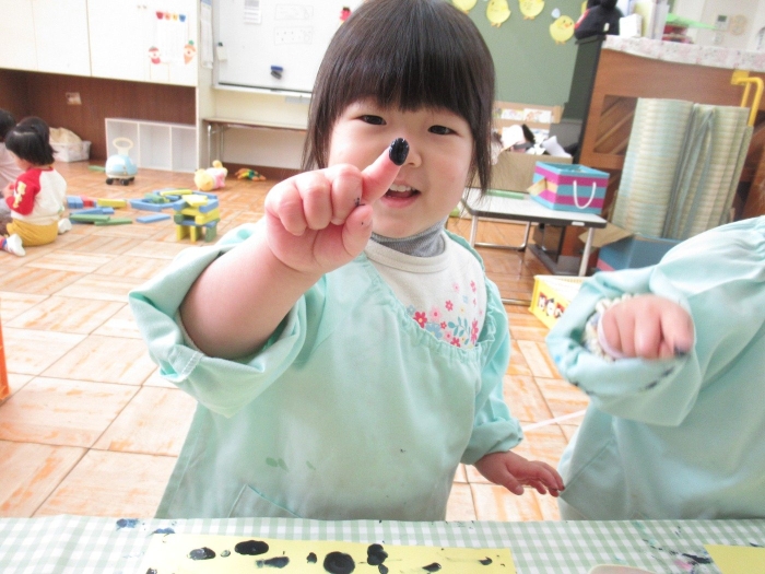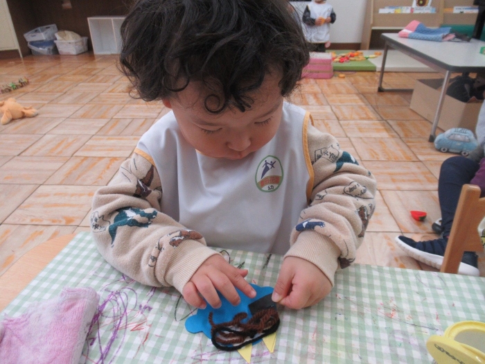 鬼のパンツは指絵の具で模様をつけていきました。絵の具の感触に始めは戸惑う姿もありましたが、次第に「気持ちい~♡」と言いながら指絵の具を楽しむ姿が見られました!