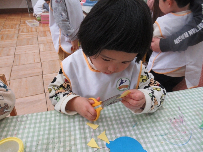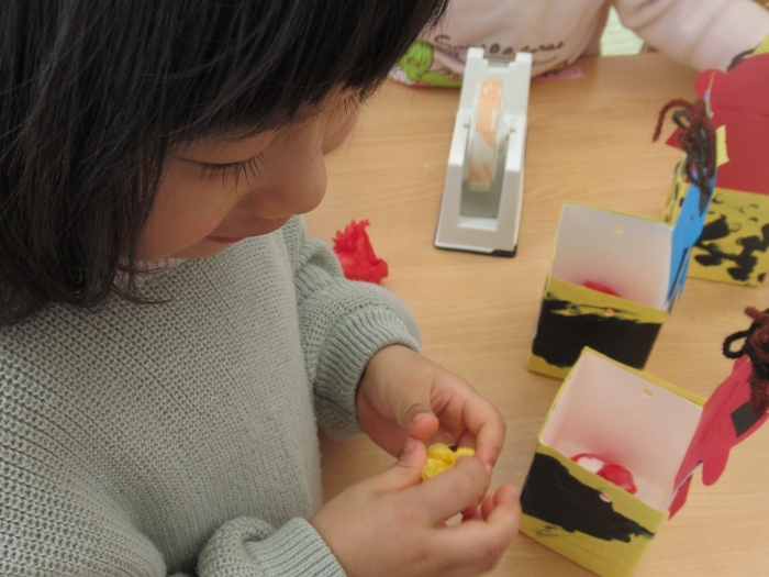鬼の顔もはさみやのりを上手に使って作ることができました☆鬼箱の中に入れる豆作りにはセロテープに初挑戦!「切れない…」と苦戦する姿もありましたが、たくさん作ってやっつける!と気合を入れながら作るお子さま達なのでした☆