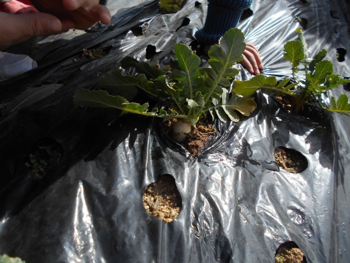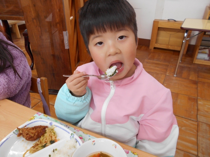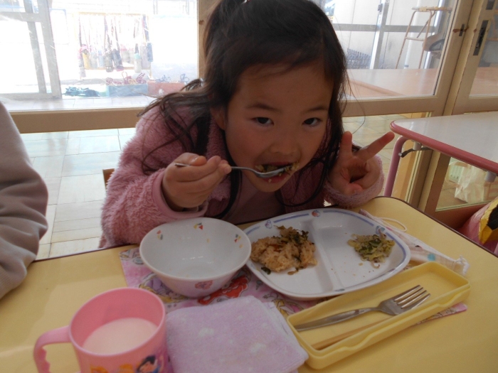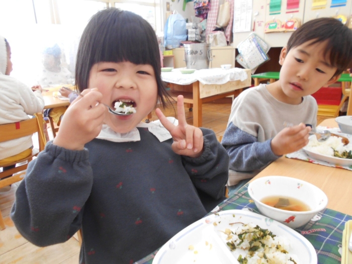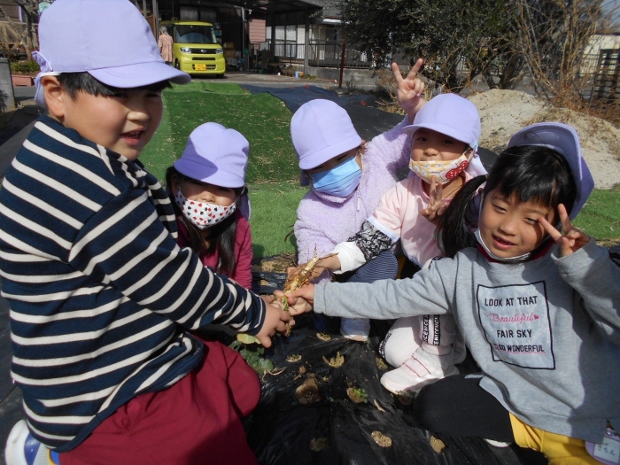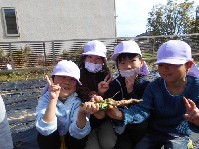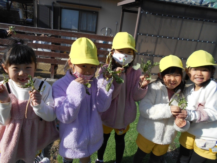 みんなで草取りや水やりをして、育ててきた大根。「大きくなったかなー。」、「まだかなー。」と散歩で畑の横を通る度に様子を見ながら、楽しみにしていました。いよいよ、収穫!小ぶりでしたが、お子さま達は、「抜けたー!!」「2つに分かれている大根だ!」と嬉しそう♪園長先生に和え物を作ってもらい、給食の時間にご飯と一緒に食べました。ペロッと食べて完食!!大きく育てるのは難しかったけど、おいしかったね♡