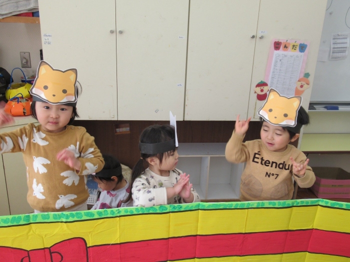 劇ごっこで使った「ぞうさんのぼうし」が保育室に戻ってくると、練習用の動物お面をつけて自然と劇ごっこ遊びが始まりました☆好きな動物に変身して楽しそうに遊ぶ姿はとてもかわいいですよ♡