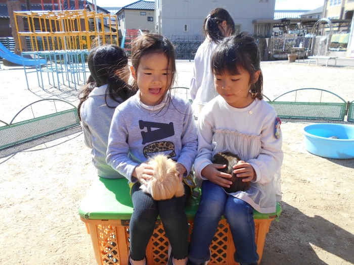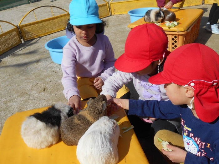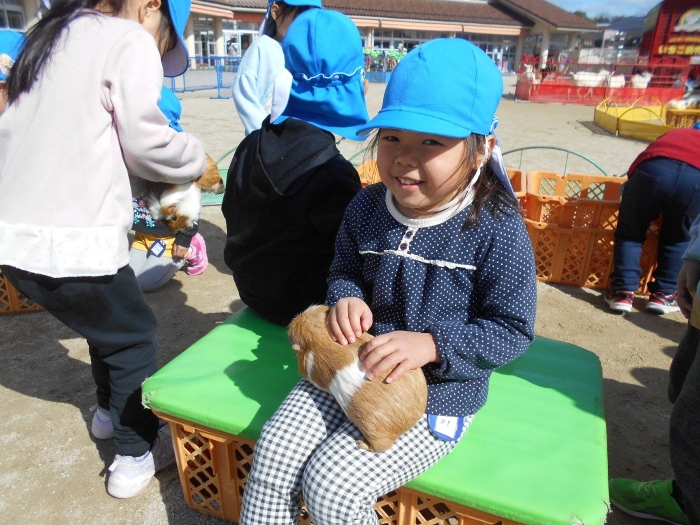 見ることはあっても、触ることはあまり経験がなかったようで、最初はおそるおそる触っていたお子さま達でしたが、少しずつ動物たちとも打ち解けたようで?( ´∀` )、やさしく撫でたり、お口の近くにえさを置いてあげたりしながら楽しむ様子がうかがえました♡年中さんと年長さんは、うさぎのいちごちゃんのトークショーといぬのみりんちゃんのショーも見せてもらいました(^▽^)/