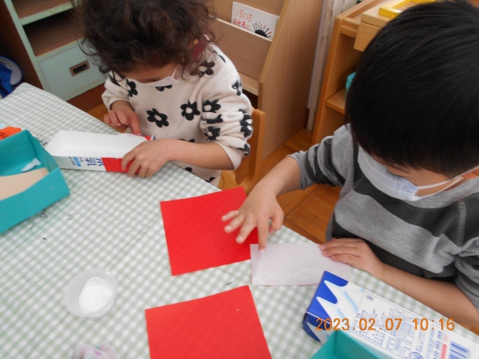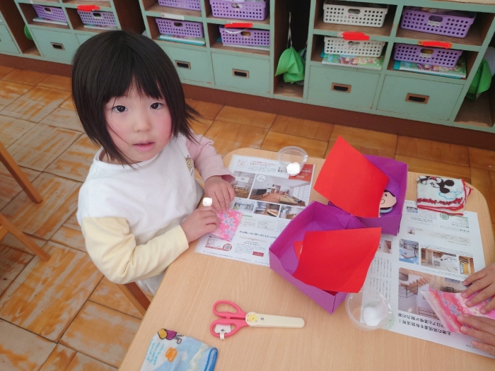 千代紙に触ってみると、「白い方がざらざらしているよ!」「匂いがいつもの折り紙とは違うね。」と、普段使っている折り紙との違いを感じているお子さまもいましたよ☺️
