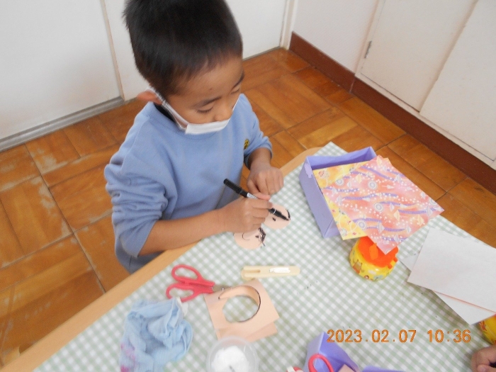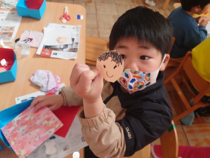 「結婚式だからにこにこのお顔にするんだ~!」「男雛はかっこいい顔、女雛はかわいい顔にしよう♪」と、思い思いに顔を描いていました❣️