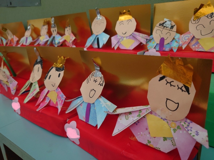 製作では、男雛と女雛の着物を千代紙で折りました✨