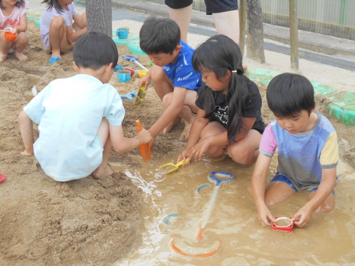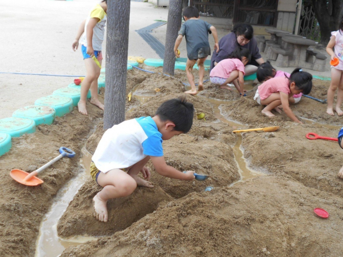 汚れてもいい格好でみんなで力を合わせて砂場いっぱいに川を作りました。