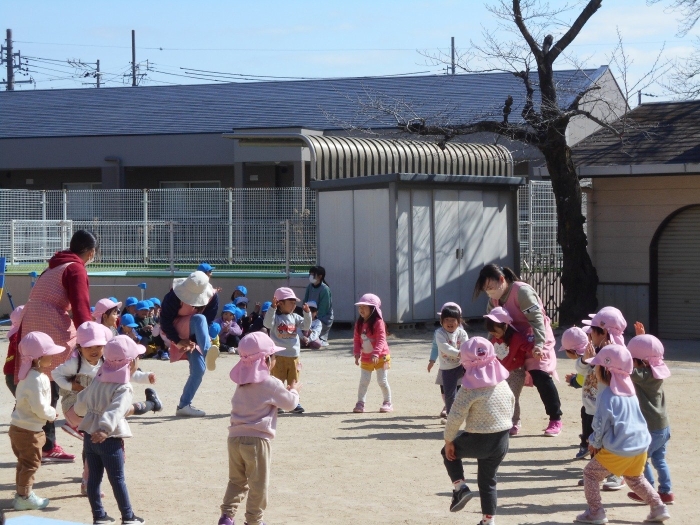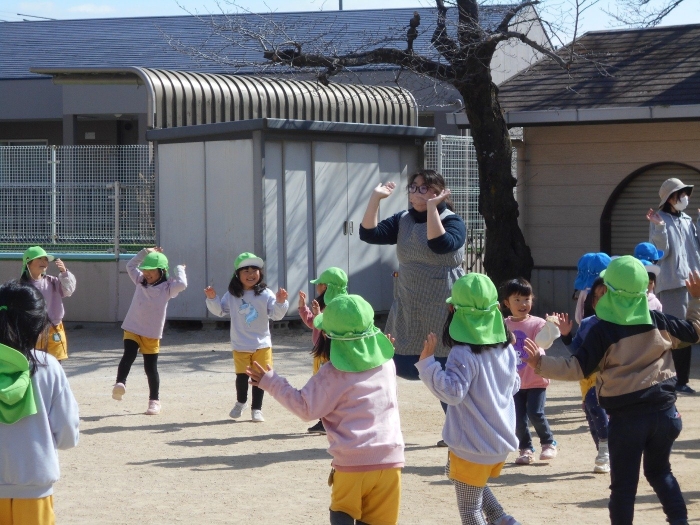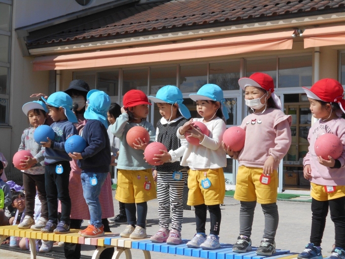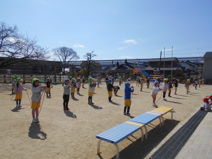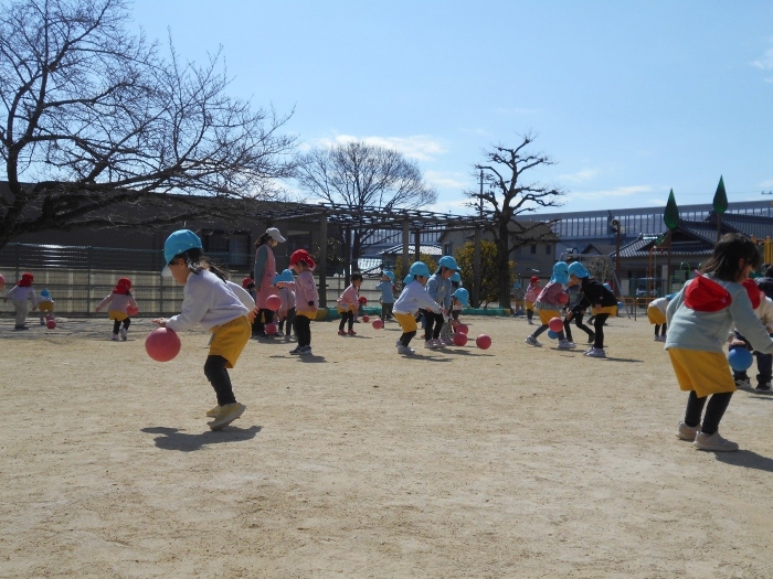 今日は年少さんが、「まりつき大会」年中・年長さんが「なわとび大会」をしました。お天気も良く、絶好の大会日和♡最初に準備体操をし、しっかり身体をほぐしてから大会に臨みました(^▽^)/