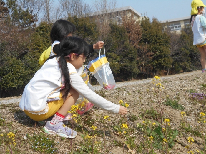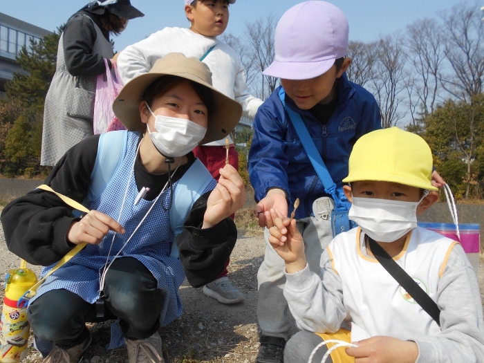 今日はお天気が良かったので、年長さんが鶴喰公園まで遊びに行ってきました!!途中、菜の花が咲いていたり、つくしが芽を出しているのを見つけたりと、春の訪れも感じることができました(^▽^)/