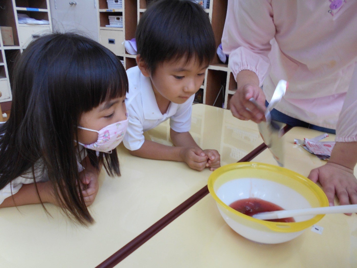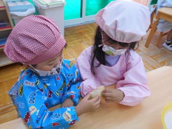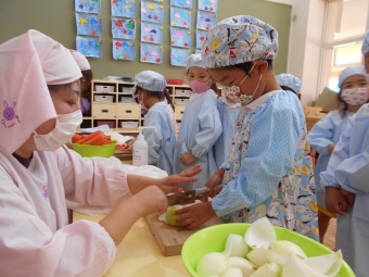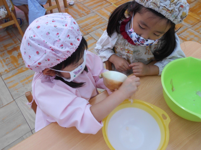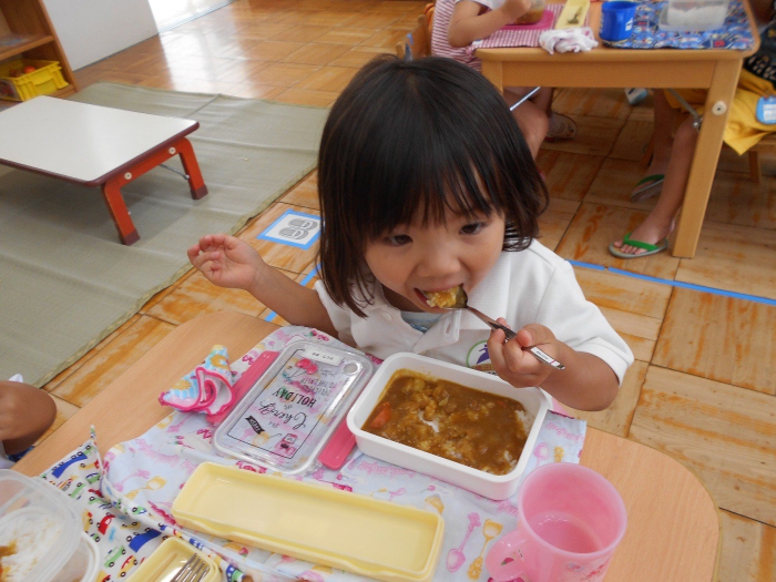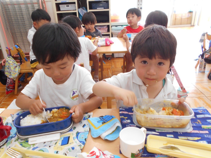 前日から年中さんが玉ねぎの皮むきを、年長さんが野菜切りをしてくれ、当日は大きな鍋でグツグツ煮込んで美味しそうなカレーが出来上がりました♡