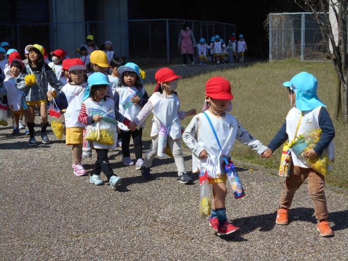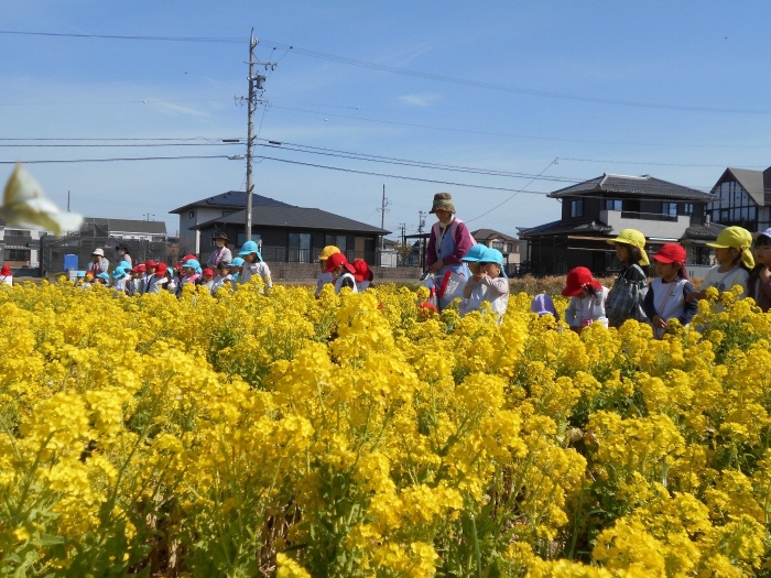 今日はとてもお天気が良かったので、年少さんと、年長さんの預かりさんで近くの菜の花畑に行ってきました。道中にもたんぽぽやつくし、ピンク色の可愛い草(ホトケノザ)が咲いていて、あたりはすっかり「春」一色♡