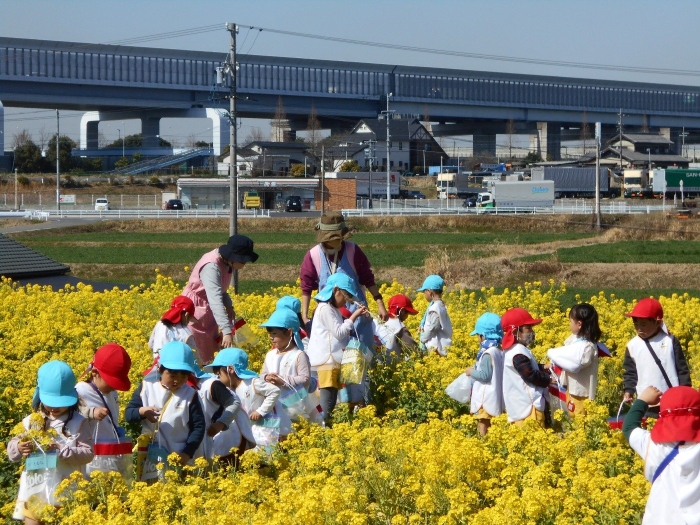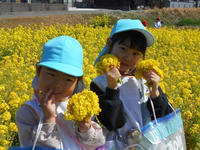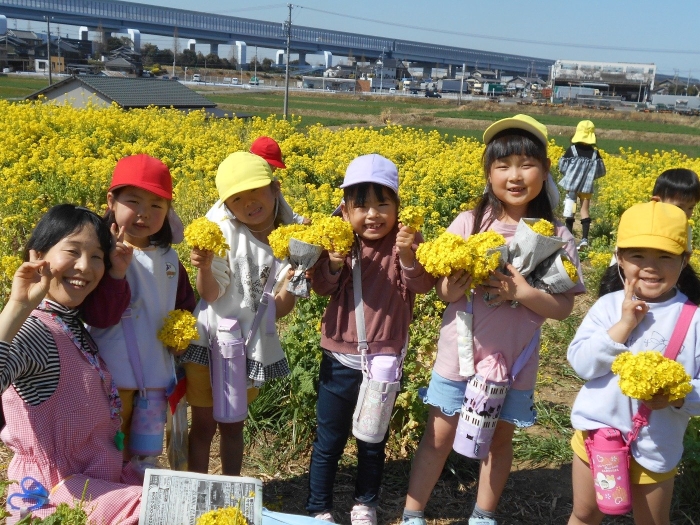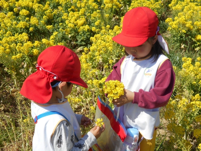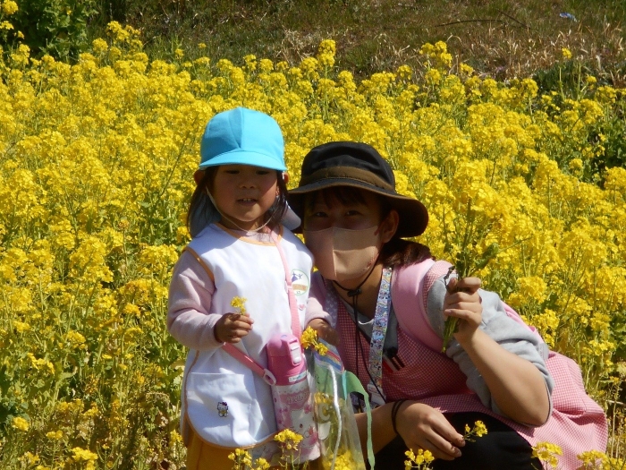 菜の花畑も満開で、お子さま達は大喜び♡「すごくきれー--い!!」と言いながら、お友だちと一緒に菜の花摘みを楽しみました。ぽかぽか陽気だったので、てんとう虫さんもたくさんいました(^▽^)/
