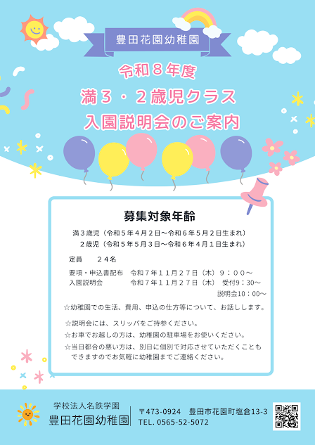 豊田花園幼稚園 0565-52-5072 平日 9:00~17:00 (土日祝日 年末年始は園はお休みです)